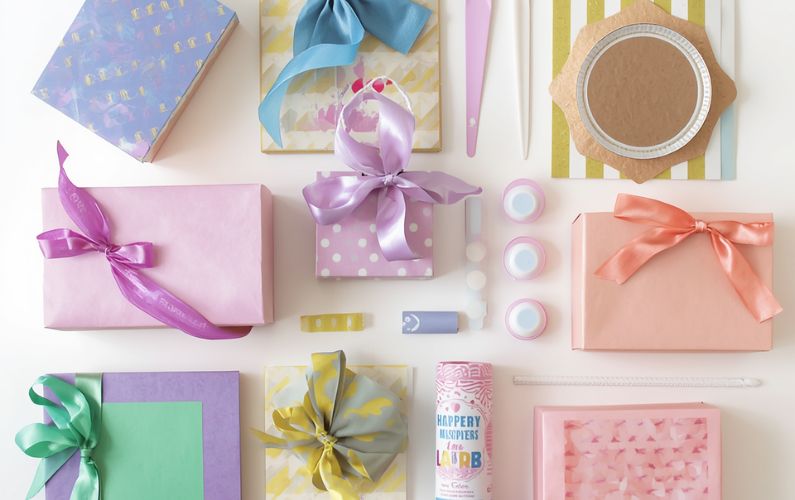 Bags, boxes, tissue paper, and accessories for putting together gift bags and party favors at scale.