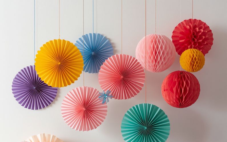 Honeycomb balls, paper fans, pom poms, and ceiling décor to fill vertical event spaces.